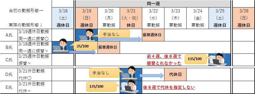 - 週休日勤務して、同一週に振替休暇をとった場合は、時間外手当なし(A氏の例)